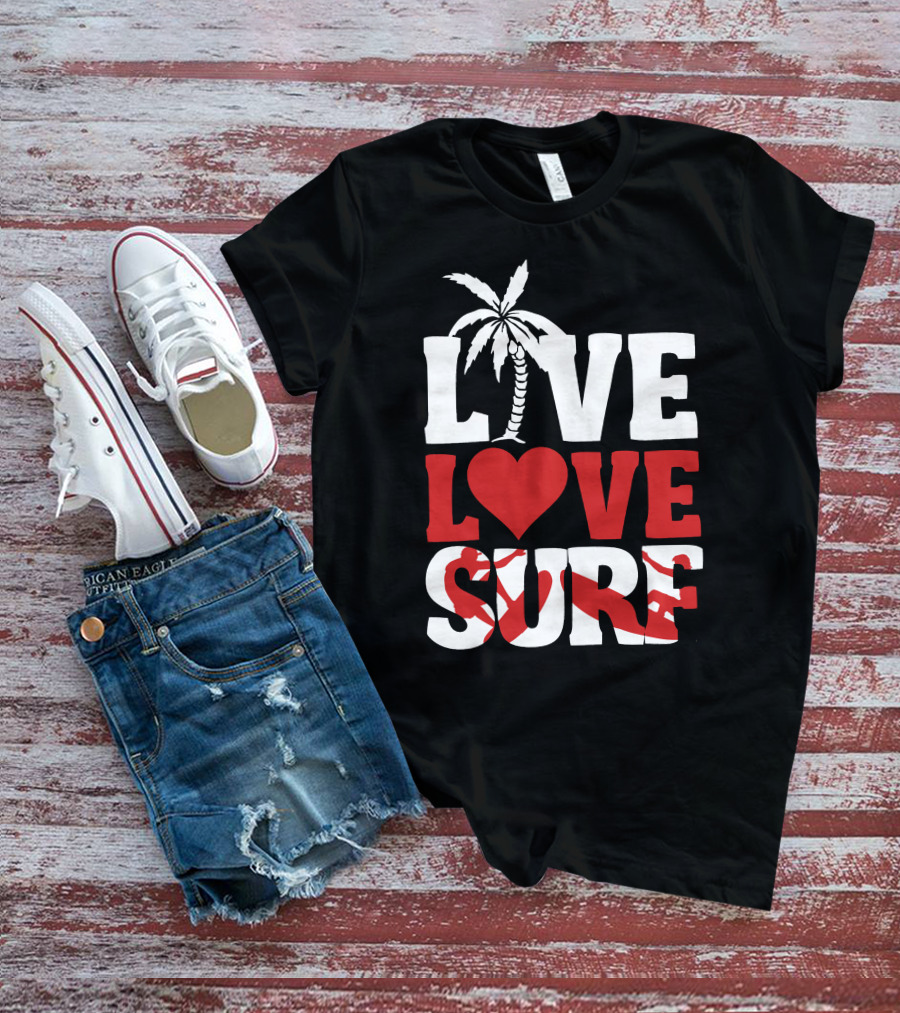 Live Love Surf Palm Tree Heart Ocean Waves T-Shirt