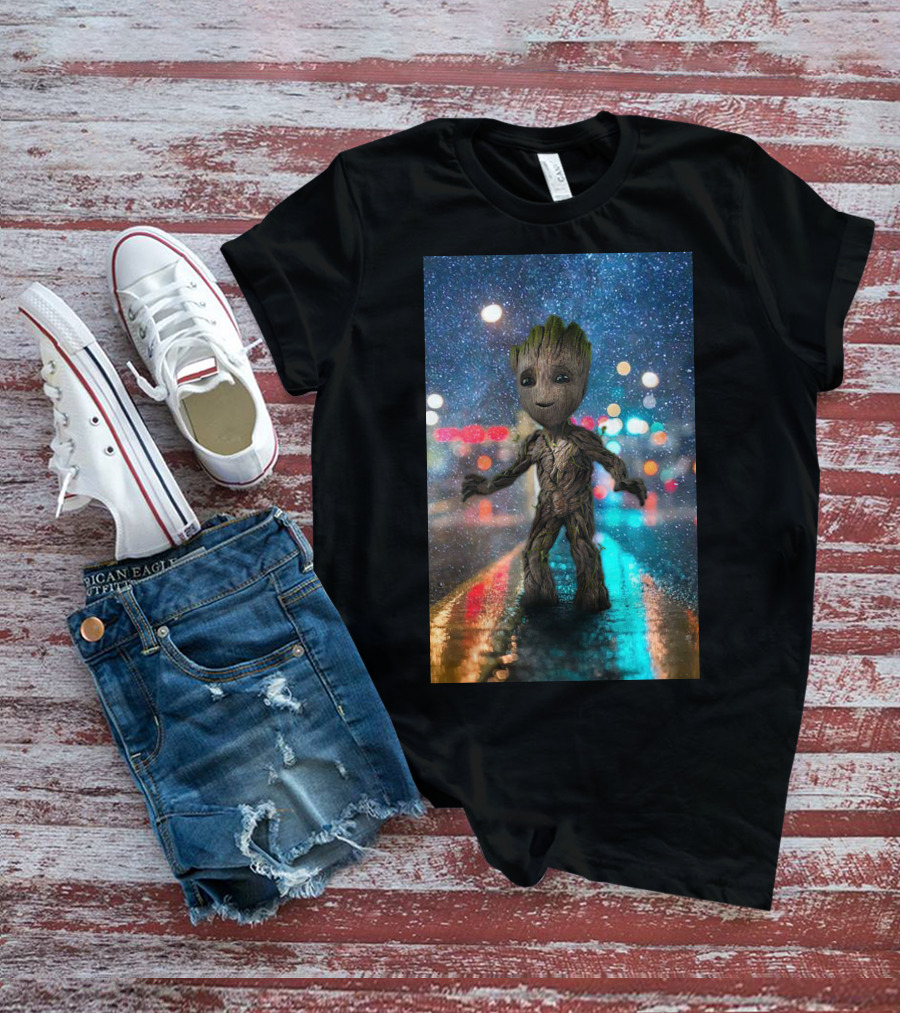 The Groot Baby Guardians Of The Galaxy Night Street Scene Shirt offers a regular fit. Made from 100% ring-spun cotton that is pre-shrunk to help maintain size and shape after washing. Features reinforced construction details for durability. Available in U.S. standard sizes S-5XL to accommodate various body types.