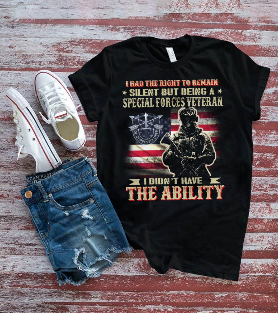 The I Had The Right To Remain Silent But Being A Special Forces Veteran I Didn't Have The Ability Shirt offers a regular fit. Made from 100% ring-spun cotton that is pre-shrunk to help maintain size and shape after washing. Features reinforced construction details for durability. Available in U.S. standard sizes S-5XL to accommodate various body types.