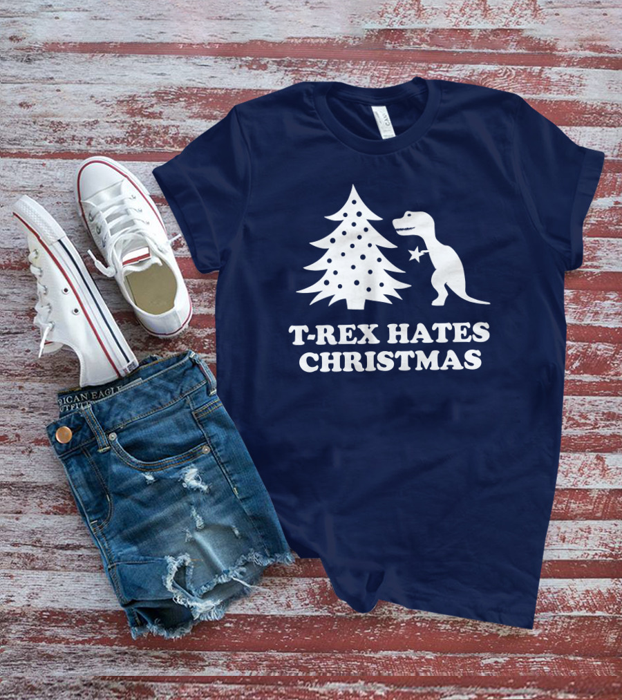 The T-Rex Hates Christmas Shirt offers a regular fit. Made from 100% ring-spun cotton that is pre-shrunk to help maintain size and shape after washing. Features reinforced construction details for durability. Available in U.S. standard sizes S-5XL to accommodate various body types.