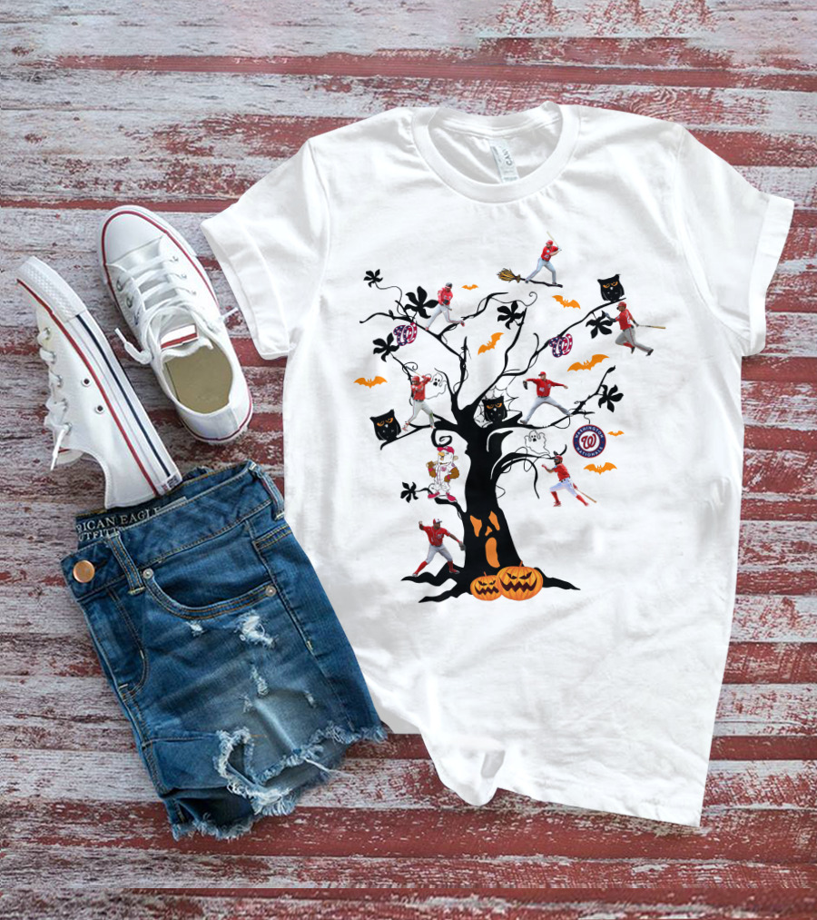 The Washington Nationals Halloween Baseball Spooky Tree with Pumpkins and Bats Shirt offers a regular fit. Made from 100% ring-spun cotton that is pre-shrunk to help maintain size and shape after washing. Features reinforced construction details for durability. Available in U.S. standard sizes S-5XL to accommodate various body types.