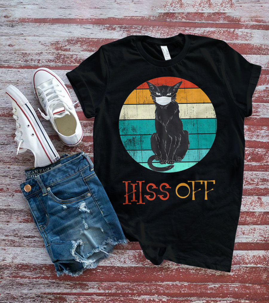 Hiss Off Black Kitty With Mask And Retro Stripes T-Shirt