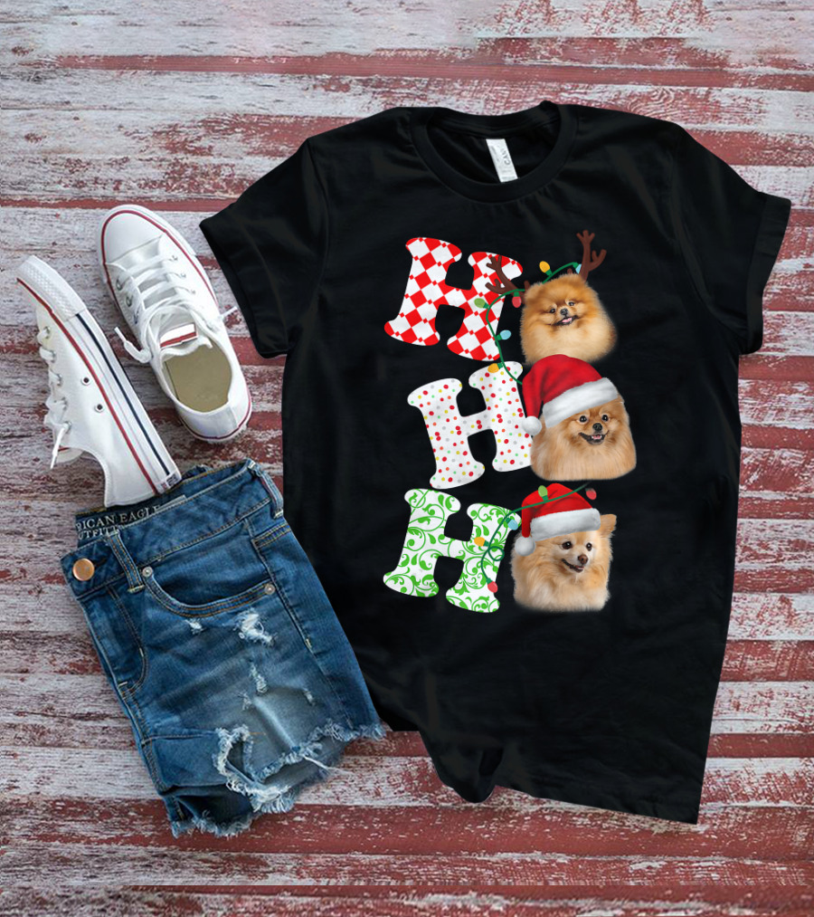 Ho Ho Ho Pomeranian Santa Hat Reindeer Antlers Christmas T-Shirt