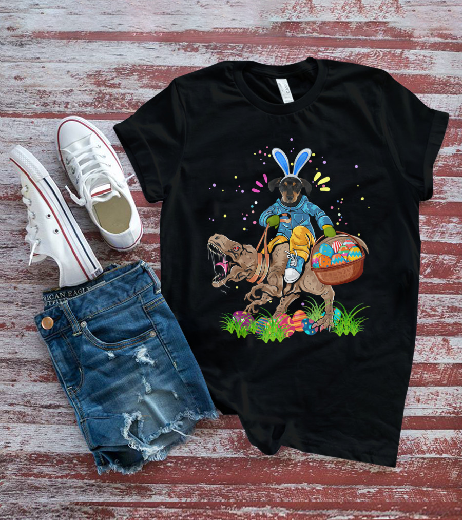 Bunny Rottweiler Dog Riding Rex Dinosaur With Easter Basket T-Shirt