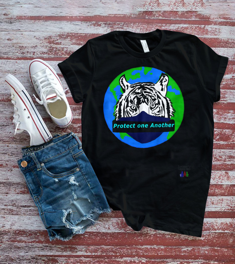 Lucmarty Protect One Another Tiger Wearing Face Mask Over Earth T-Shirt