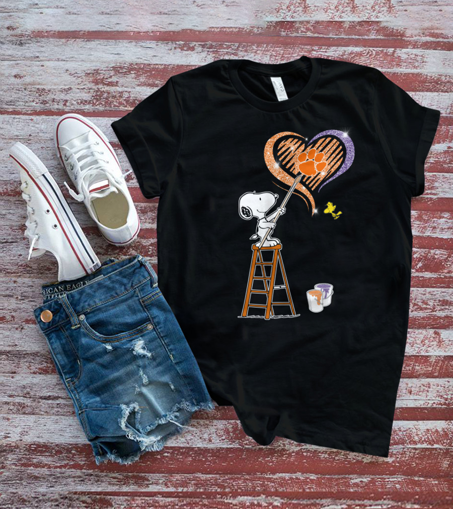 Snoopy Painting Clemson Tigers Heart With Paw Print And Woodstock T-Shirt