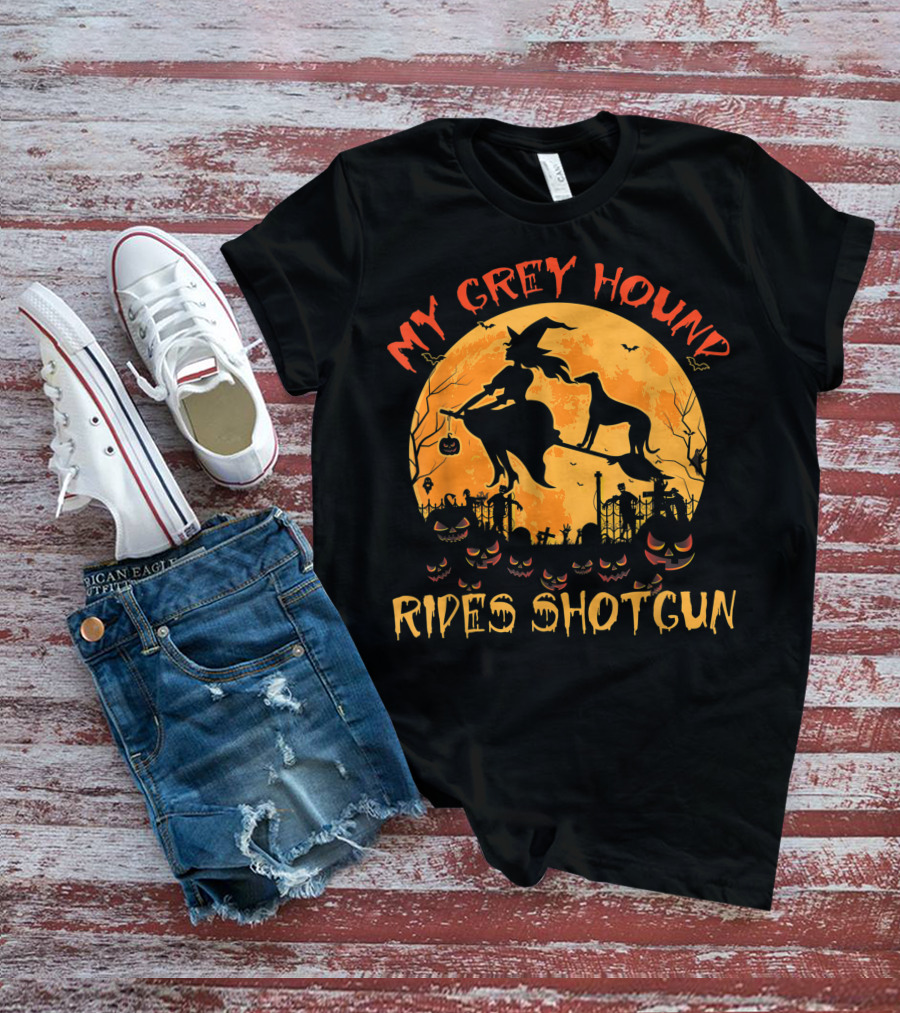 My Greyhound Rides Shotgun Witch Halloween Moon Pumpkins T-Shirt