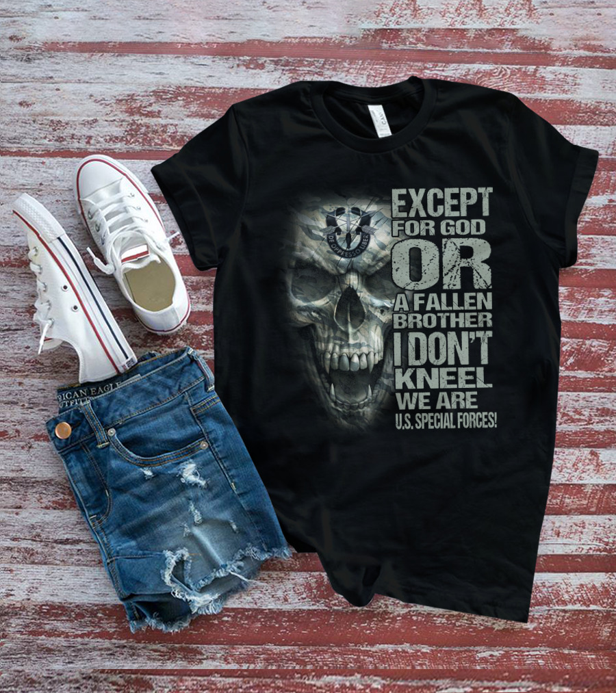 The Except For God Or A Fallen Brother I Don't Kneel We Are U.s. Special Forces De Oppresso Liber Skull Shirt offers a regular fit. Made from 100% ring-spun cotton that is pre-shrunk to help maintain size and shape after washing. Features reinforced construction details for durability. Available in U.S. standard sizes S-5XL to accommodate various body types.