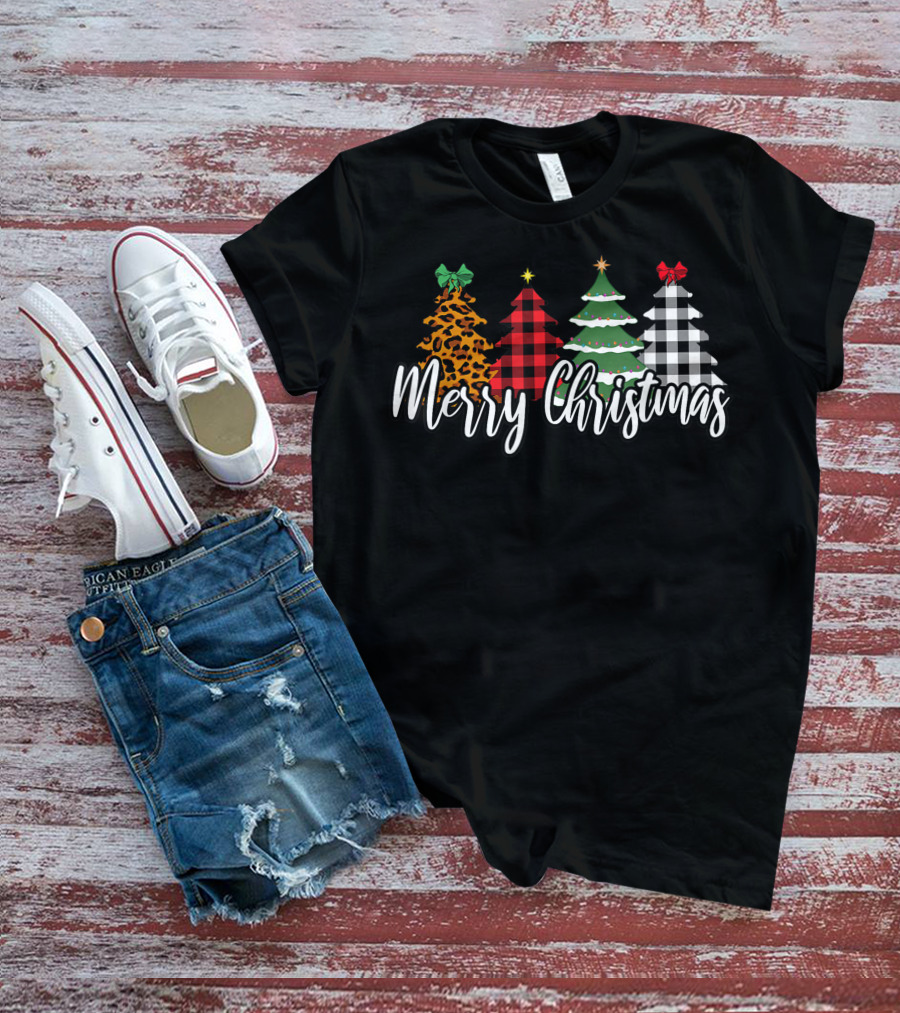 Merry Christmas Leopard Print Buffalo Plaid Holiday Trees T-Shirt