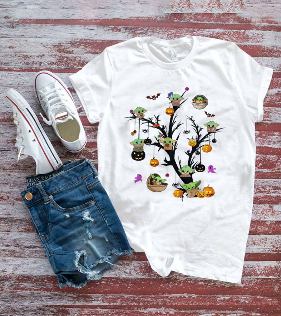 Spooky Halloween Baby Yoda Tree With Pumpkins And Bats T-Shirt