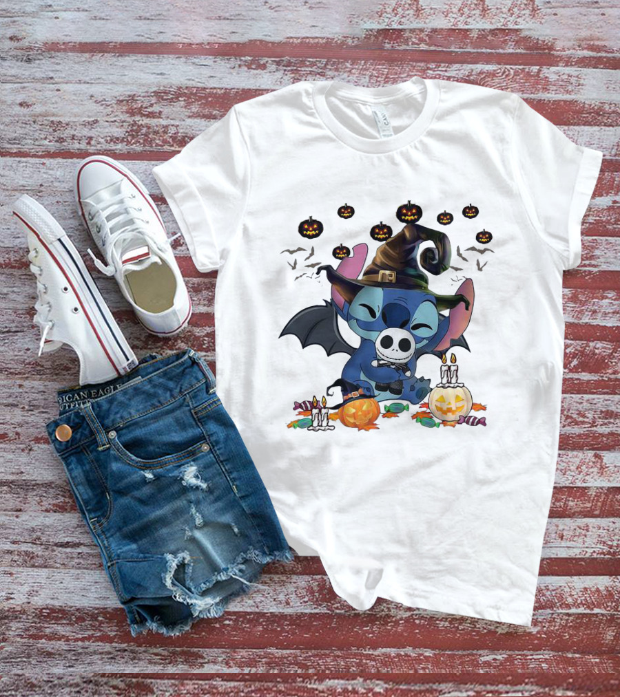 Halloween Stitch With Jack Skellington Mask And Bats T-Shirt