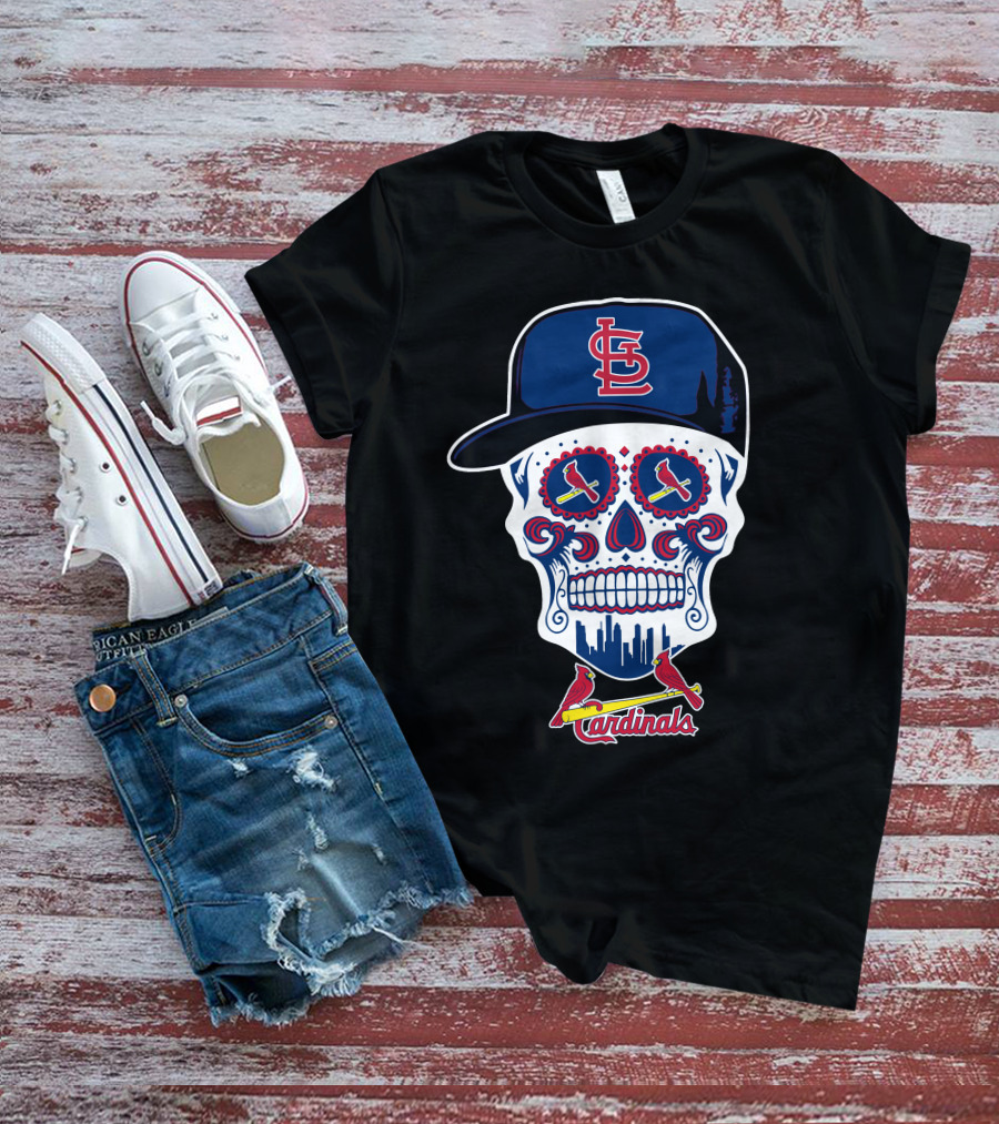 St Louis Cardinals Sugar Skull With Cap And Logos T-Shirt