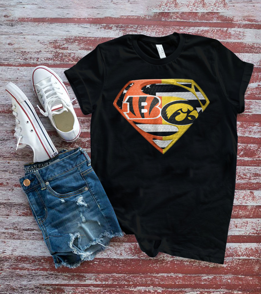 The Superman Logo Cincinnati Bengals Iowa Hawkeyes Football Flag Shirt offers a regular fit. Made from 100% ring-spun cotton that is pre-shrunk to help maintain size and shape after washing. Features reinforced construction details for durability. Available in U.S. standard sizes S-5XL to accommodate various body types.