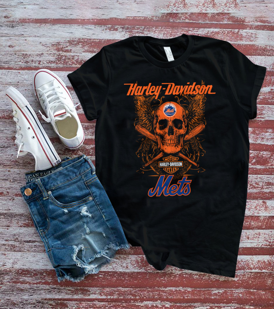 Harley Davidson New York Mets Motor Cycles Skull Wings Crossed Bats 18 T-Shirt