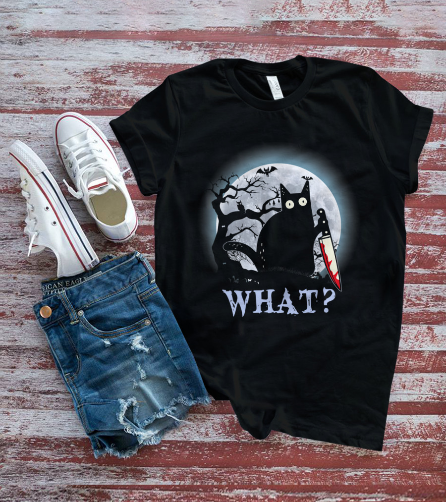 The What? Black Cat With Knife Moon Halloween Scene Shirt offers a regular fit. Made from 100% ring-spun cotton that is pre-shrunk to help maintain size and shape after washing. Features reinforced construction details for durability. Available in U.S. standard sizes S-5XL to accommodate various body types.