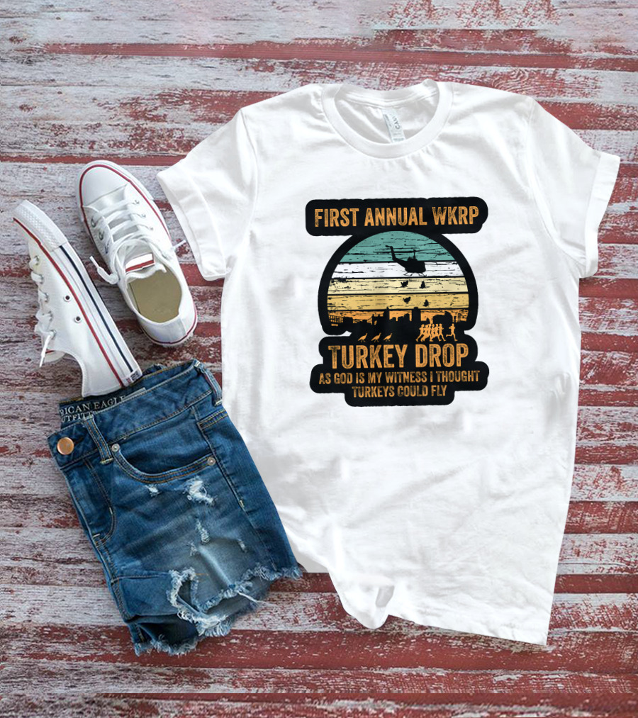 The First Annual WKRP Turkey Drop As God Is My Witness I Thought Turkeys Could Fly Shirt offers a regular fit. Made from 100% ring-spun cotton that is pre-shrunk to help maintain size and shape after washing. Features reinforced construction details for durability. Available in U.S. standard sizes S-5XL to accommodate various body types.