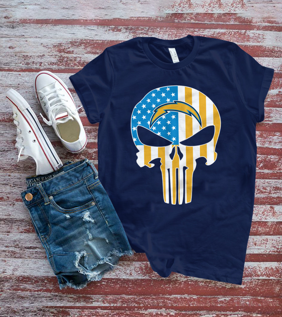 The Los Angeles Chargers Skull Punisher American Flag Shirt offers a regular fit. Made from 100% ring-spun cotton that is pre-shrunk to help maintain size and shape after washing. Features reinforced construction details for durability. Available in U.S. standard sizes S-5XL to accommodate various body types.