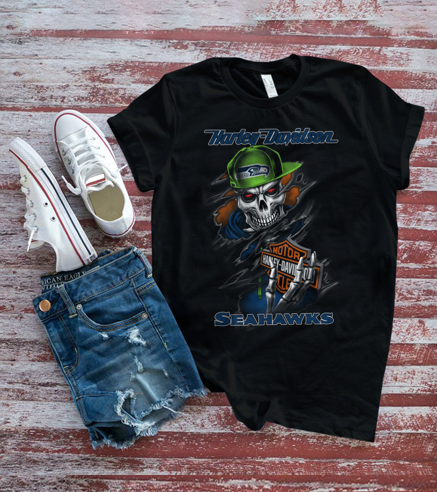 Harley Davidson Seahawks Skull With Motorcycle T-Shirt
