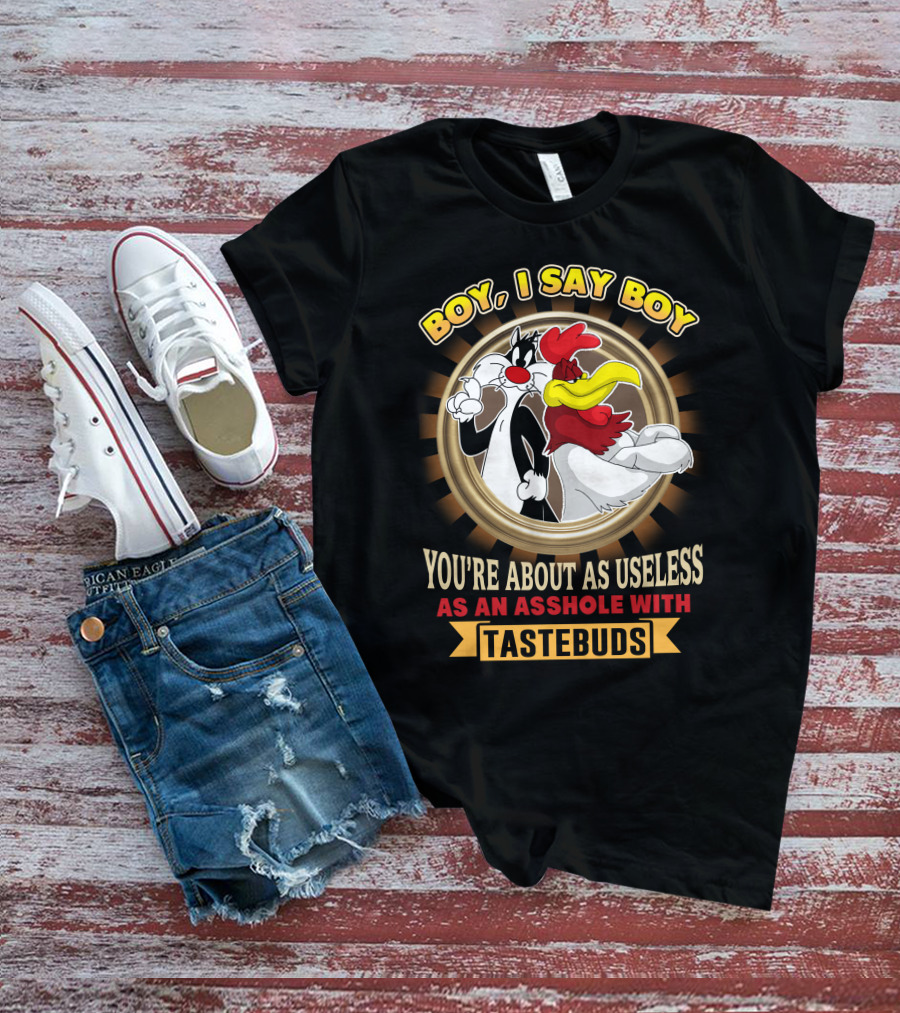 The BOY I SAY BOY YOU'RE ABOUT AS USELESS AS AN ASSHOLE WITH TASTEBUDS Shirt offers a regular fit. Made from 100% ring-spun cotton that is pre-shrunk to help maintain size and shape after washing. Features reinforced construction details for durability. Available in U.S. standard sizes S-5XL to accommodate various body types.
