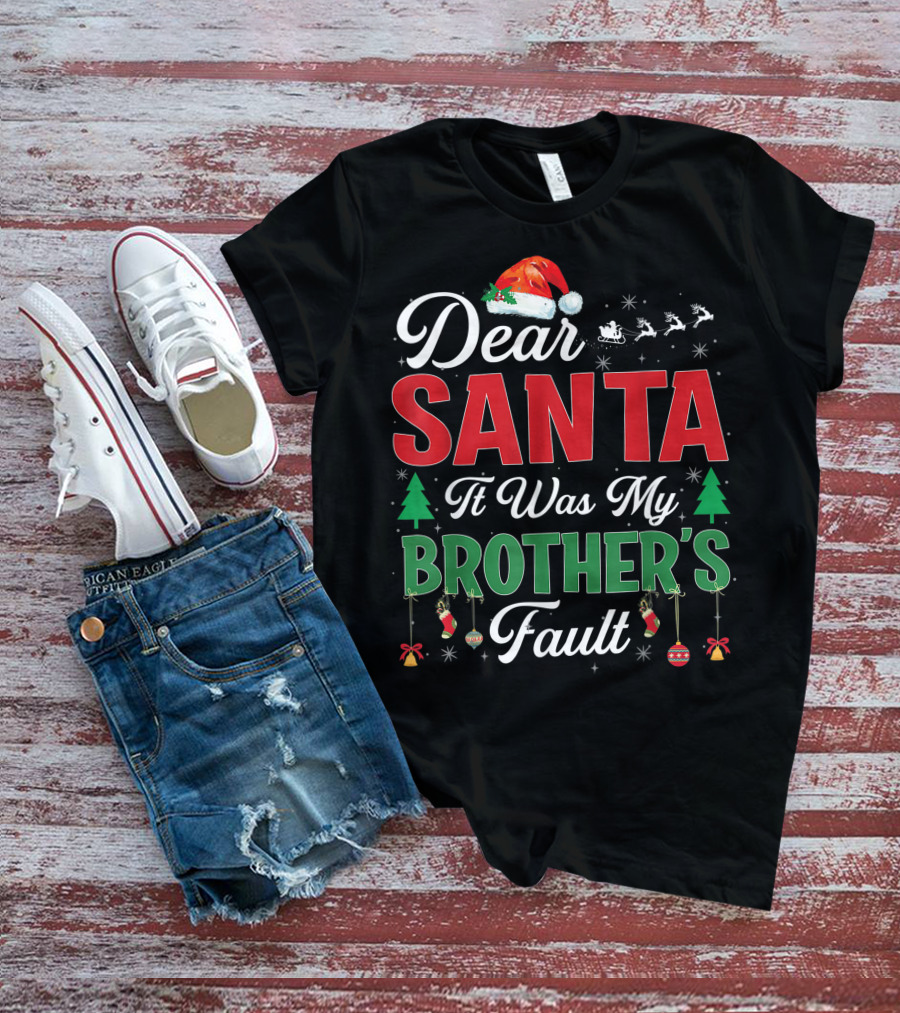 Dear Santa It Was My Brother's Fault Santa Hat Christmas Trees Sleigh Reindeer Ornaments T-Shirt