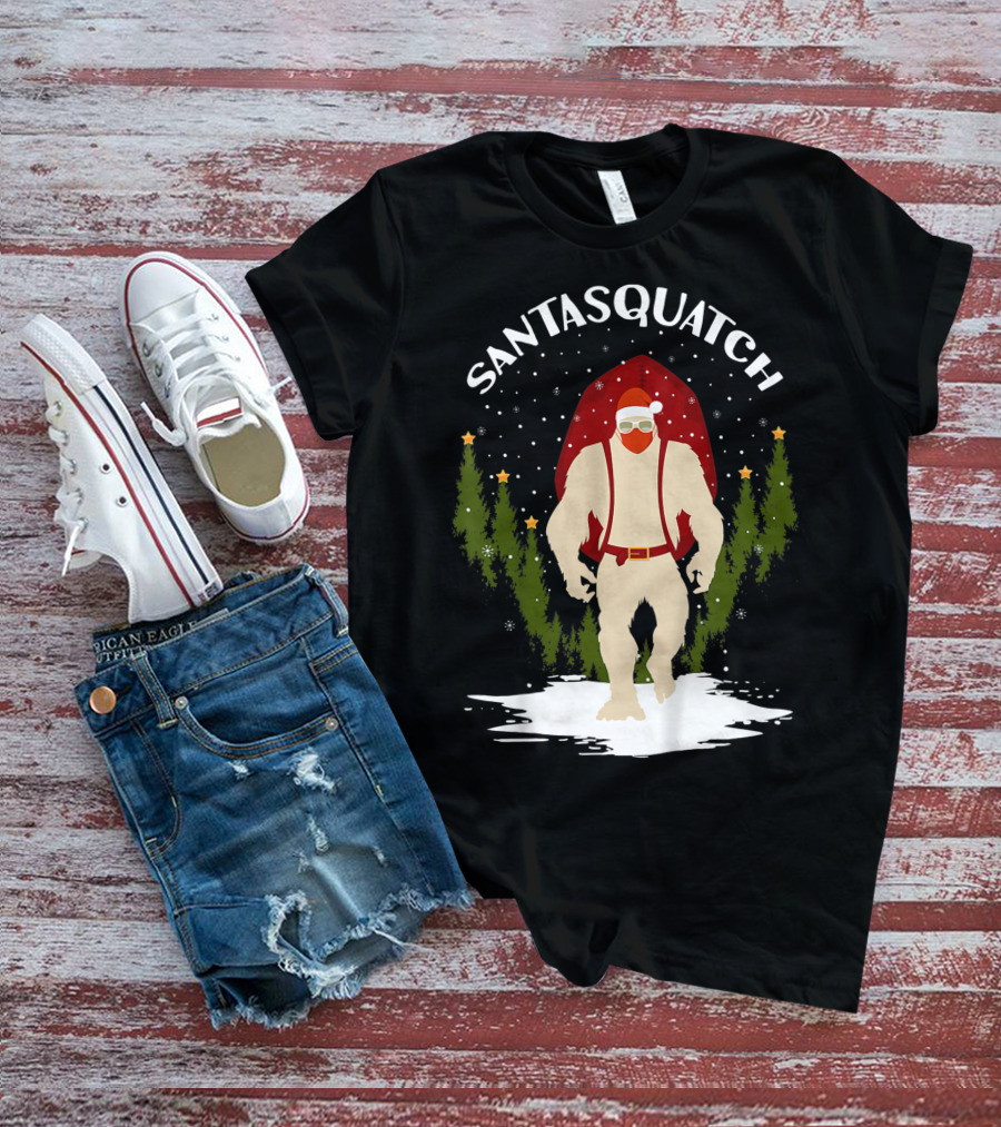 Santasquatch Bigfoot Christmas Santa Hat With Trees And Snowflakes T-Shirt