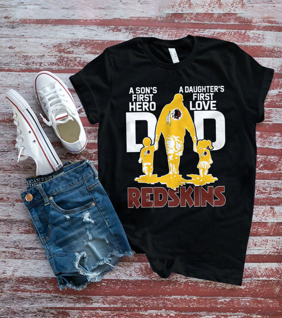 The Son's First Hero Daughter's First Love Dad Redskins Shirt offers a regular fit. Made from 100% ring-spun cotton that is pre-shrunk to help maintain size and shape after washing. Features reinforced construction details for durability. Available in U.S. standard sizes S-5XL to accommodate various body types.