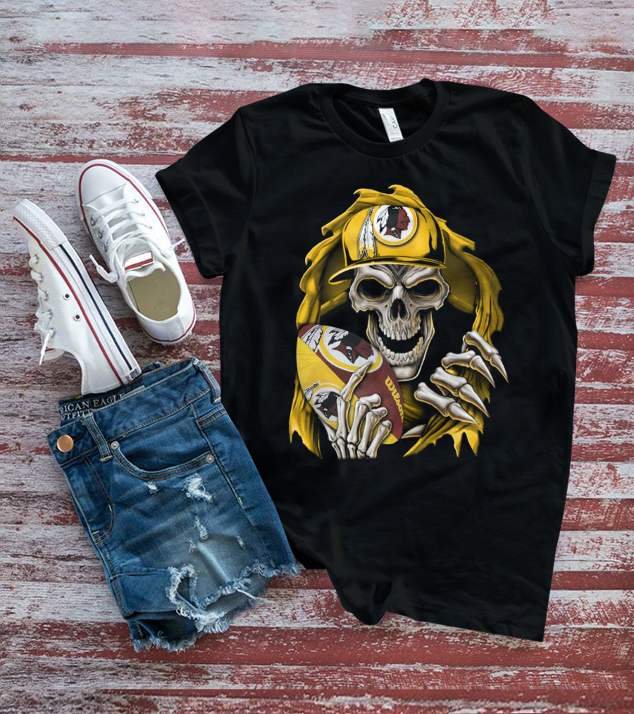 Skullbong Washington Redskins Skeleton Holding Football With Logo And Yellow Cap T-Shirt