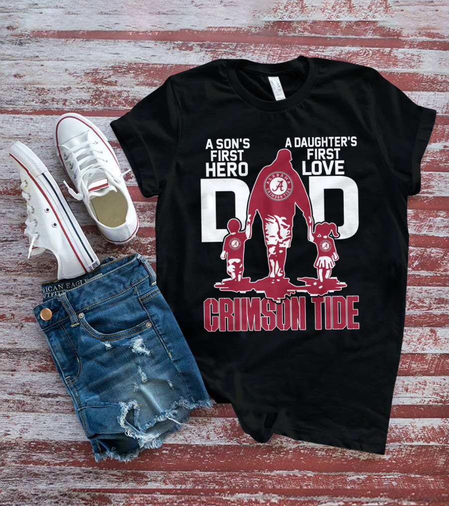 The A Son's First Hero A Daughter's First Love Dad Alabama Crimson Tide Shirt offers a regular fit. Made from 100% ring-spun cotton that is pre-shrunk to help maintain size and shape after washing. Features reinforced construction details for durability. Available in U.S. standard sizes S-5XL to accommodate various body types.