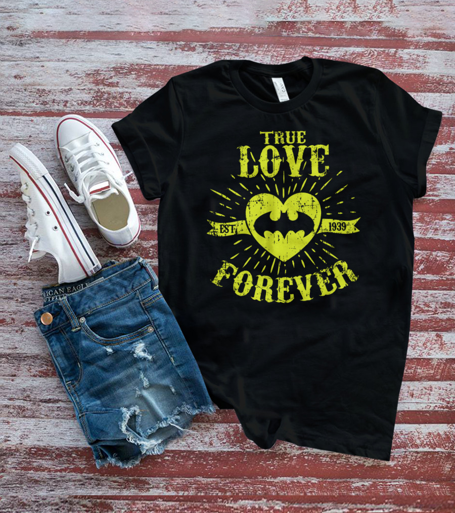 The TRUE LOVE FOREVER BAT EST 1939 Shirt offers a regular fit. Made from 100% ring-spun cotton that is pre-shrunk to help maintain size and shape after washing. Features reinforced construction details for durability. Available in U.S. standard sizes S-5XL to accommodate various body types.
