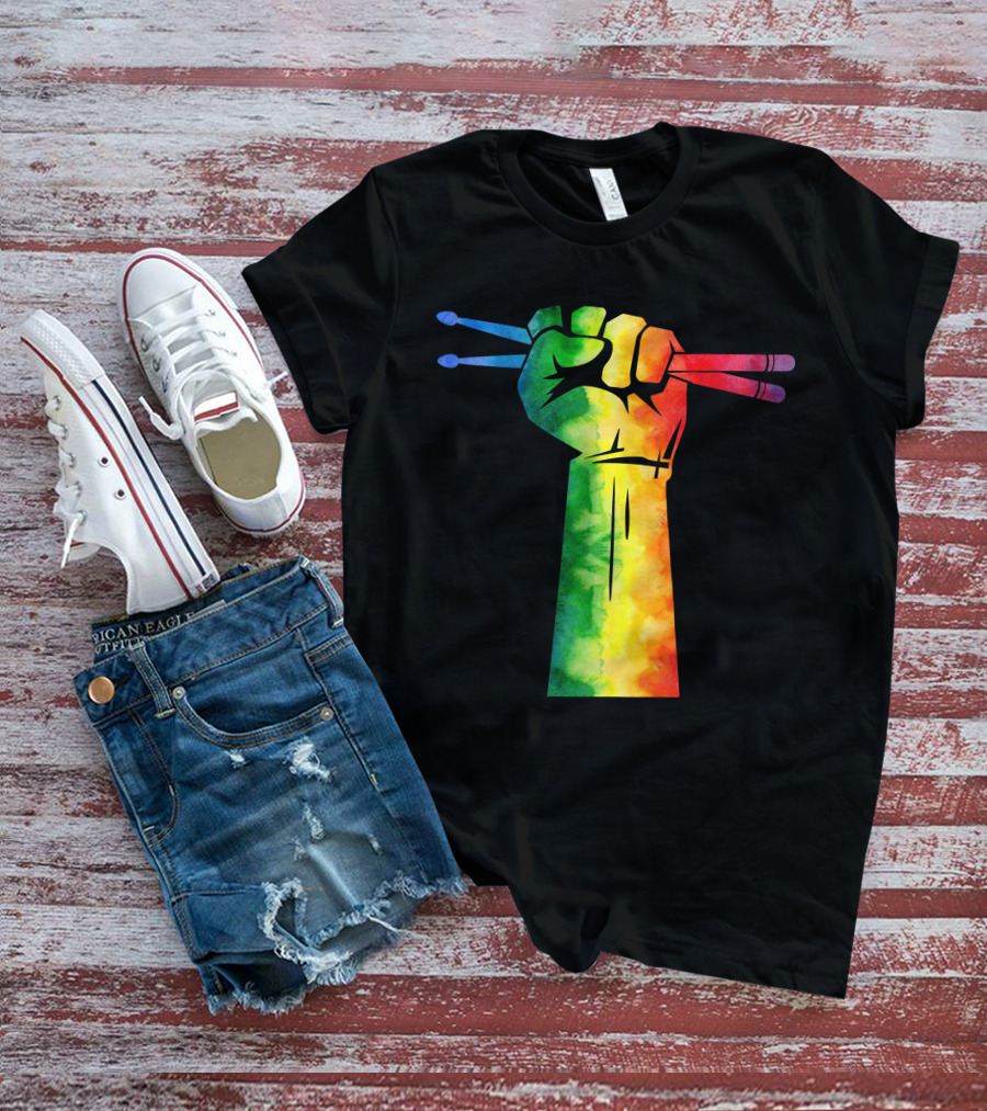 The Drumstick Drummer Rainbow Fist Shirt offers a regular fit. Made from 100% ring-spun cotton that is pre-shrunk to help maintain size and shape after washing. Features reinforced construction details for durability. Available in U.S. standard sizes S-5XL to accommodate various body types.