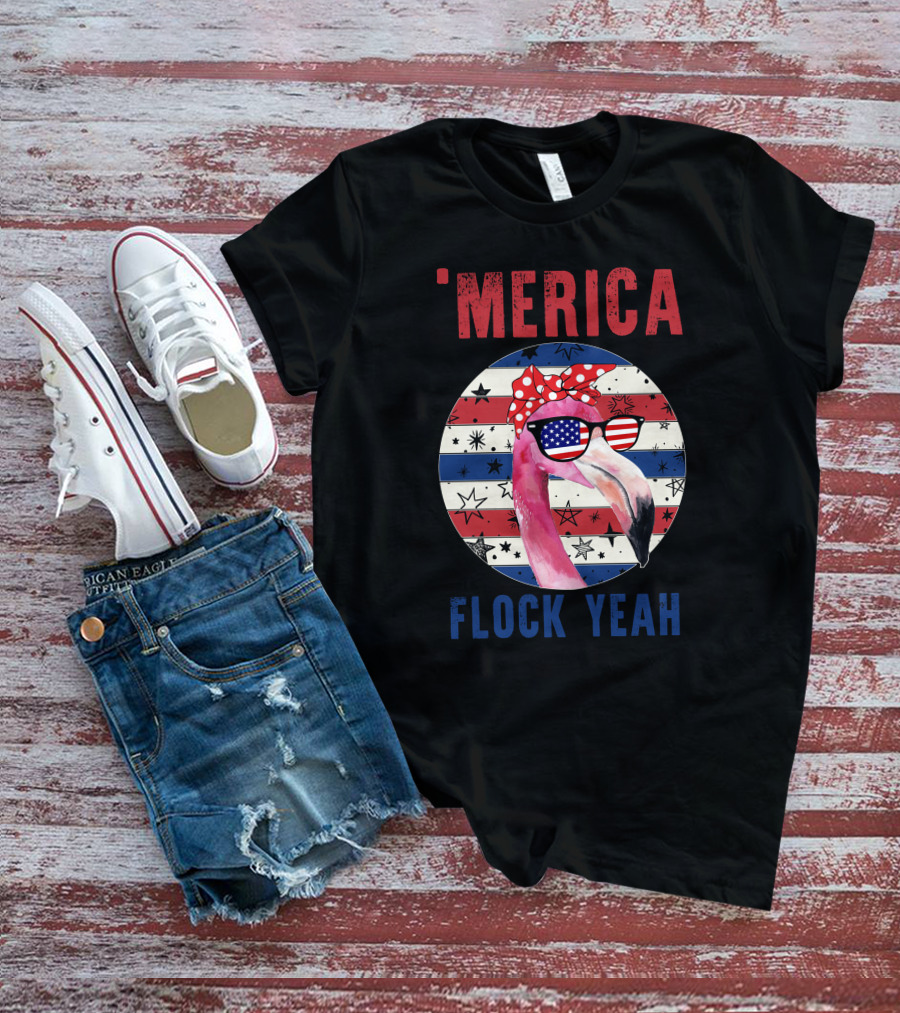 'Merica Flock Yeah Patriotic Flamingo With Flag Sunglasses T-Shirt
