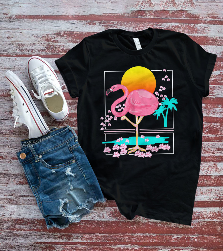 Flamingo Tropical Flowers And Sunset Scene T-Shirt