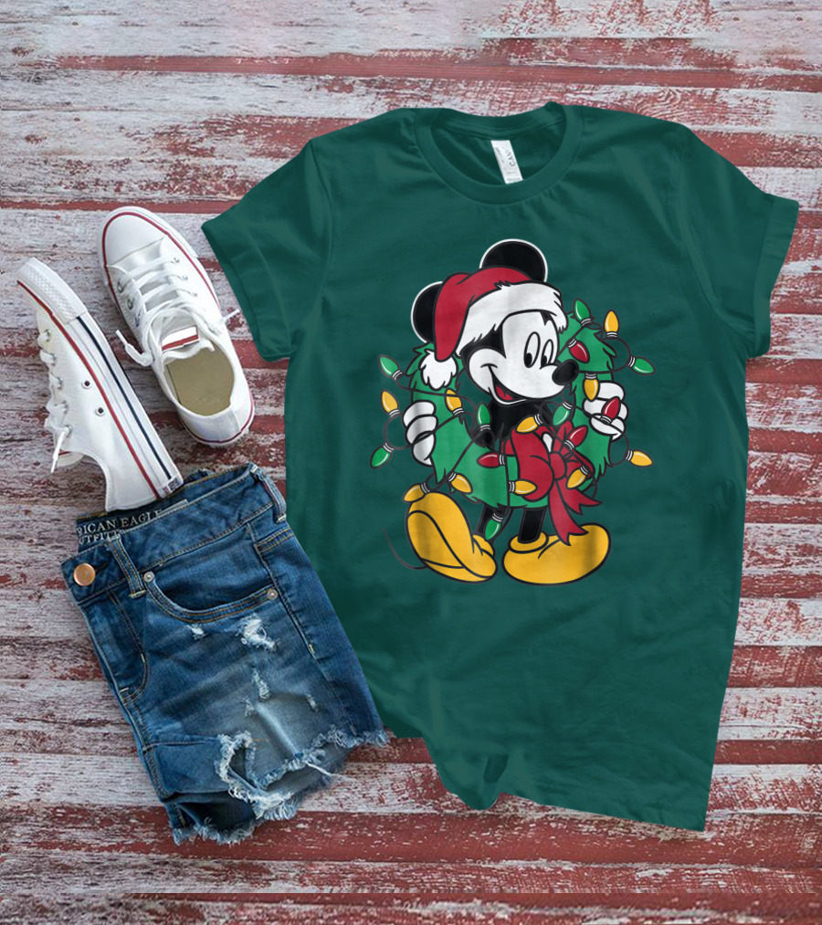 Disney Mickey Mouse Santa Hat Christmas Lights Wreath T-Shirt