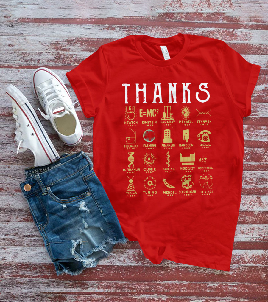 THANKS Newton Einstein Faraday Maxwell Feynman Fibonacci Fleming Franklin Bardeen Bell R. Franklin Curie Pauling Mendeleev Heisenberg Tesla Turing Mendel Schrodinger Da Vinci T-Shirt