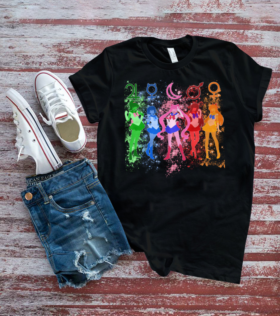 Sailor Moon The Inner Senshi With Planetary Symbols And Colorful Cosmic Background T-Shirt