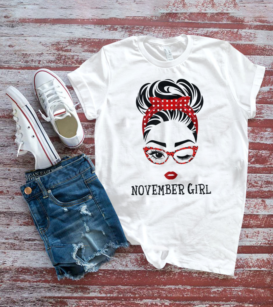 November Girl Wink Eye Woman Face Wink Eyes Lady Birthday Red Polka Dot Glasses T-Shirt