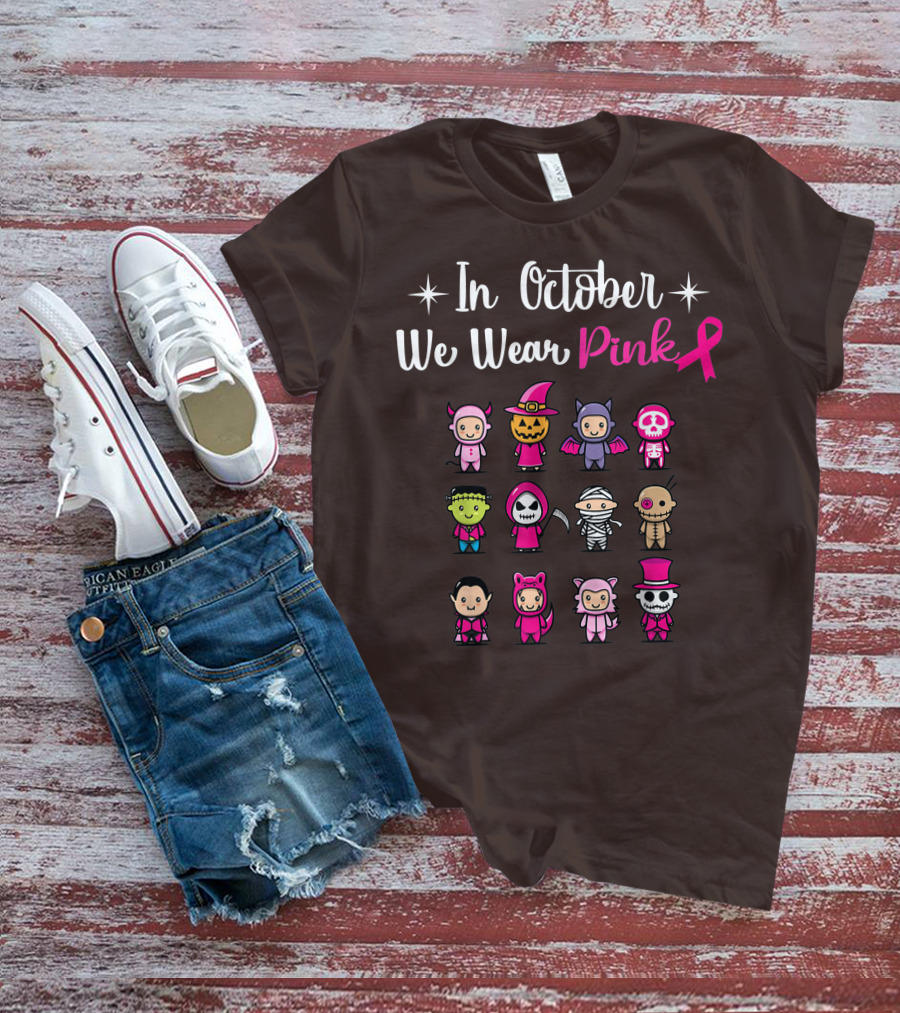 In October We Wear Pink Breast Cancer Awareness Halloween Characters T-Shirt