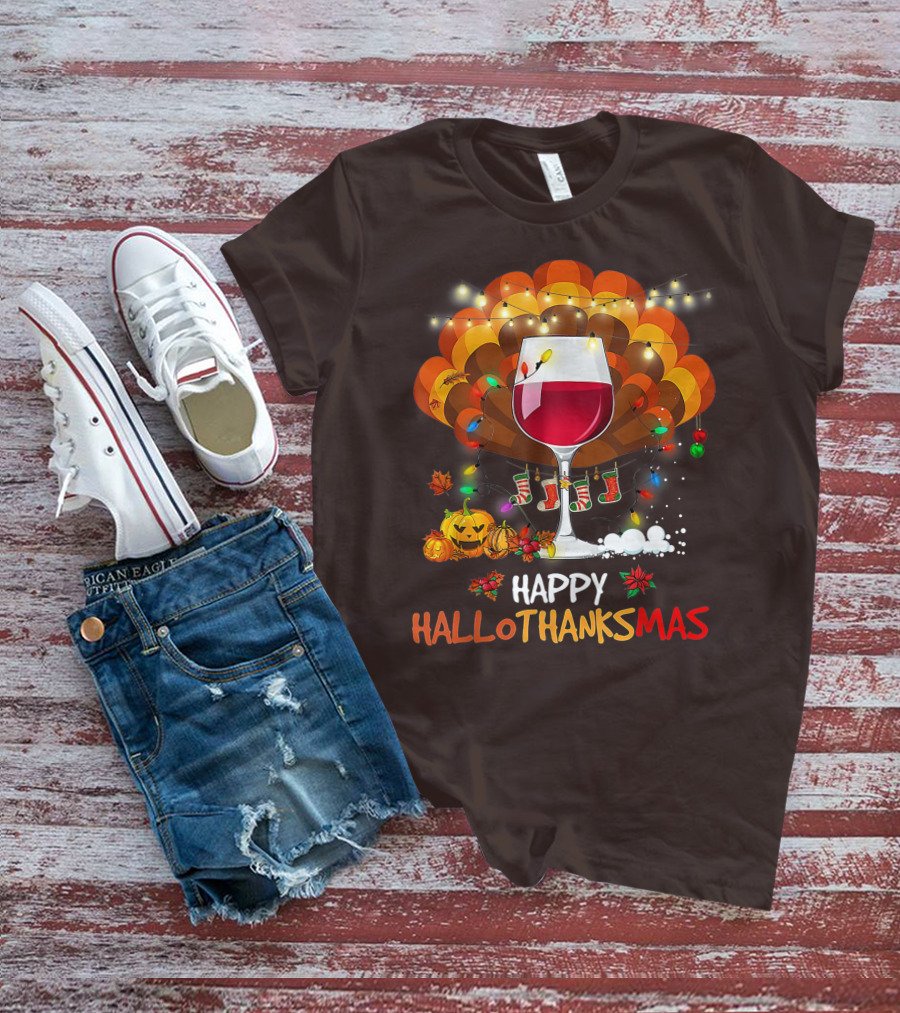 Happy Hallothanksmas Wine Glass Thanksgiving Funny Wine T-Shirt