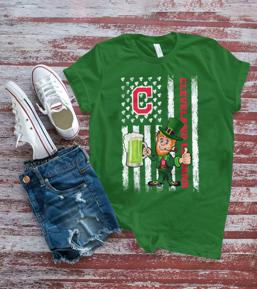 Cleveland Indians St Patrick's Day Leprechaun With Shamrock Flag And Beer Mug T-Shirt