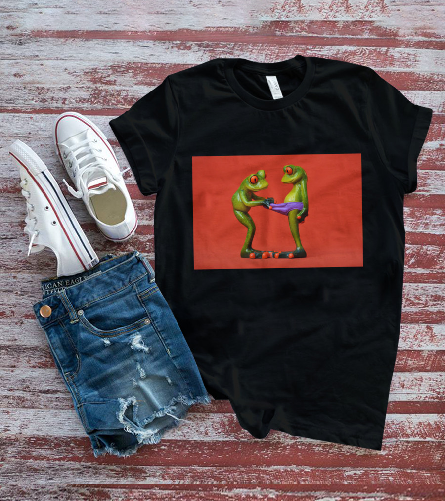 Quite Frog Green Figurines On Red Background With Purple Shorts T-Shirt