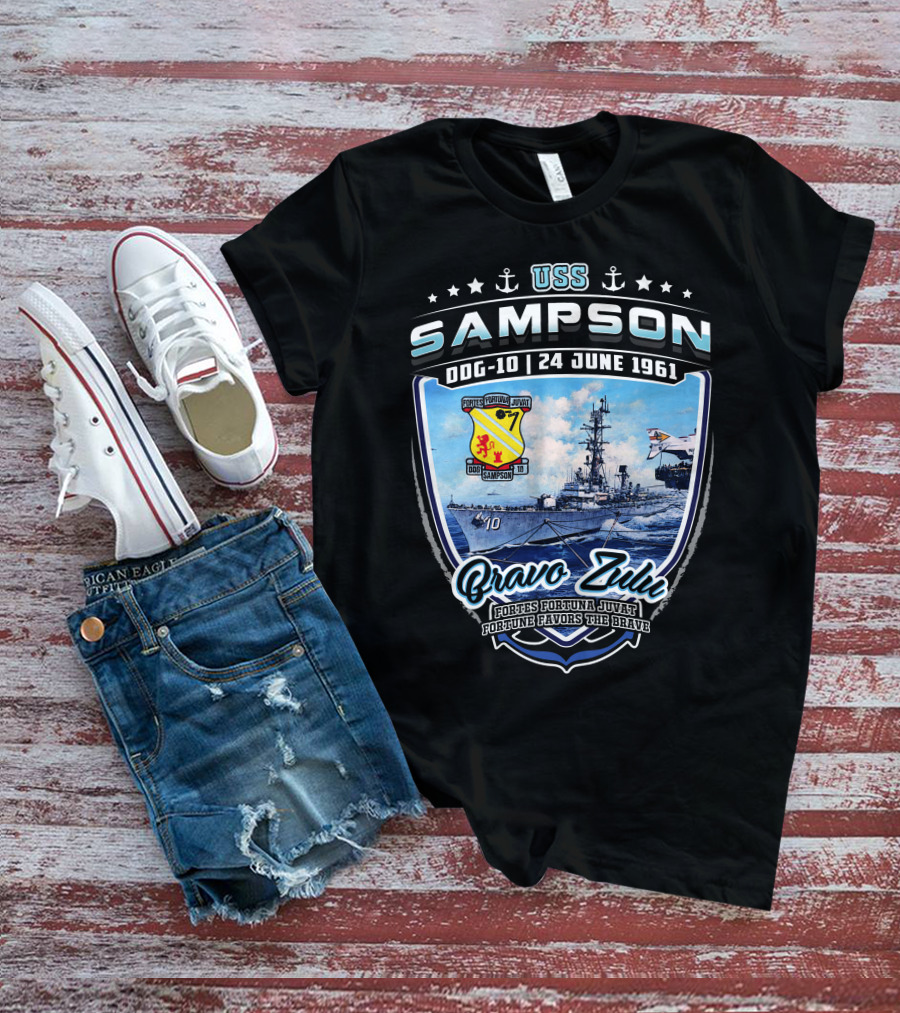 The Uss Sampson Ddg-10 24 June 1961 Bravo Zulu Fortes Fortuna Juvat Fortune Favors The Brave Shirt offers a regular fit. Made from 100% ring-spun cotton that is pre-shrunk to help maintain size and shape after washing. Features reinforced construction details for durability. Available in U.S. standard sizes S-5XL to accommodate various body types.