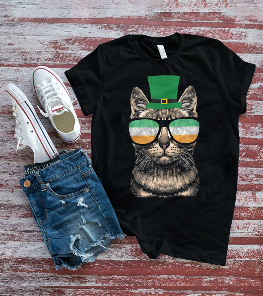 St Patrick's Day Cat Kitty Wearing Irish Green Hat And Glasses T-Shirt