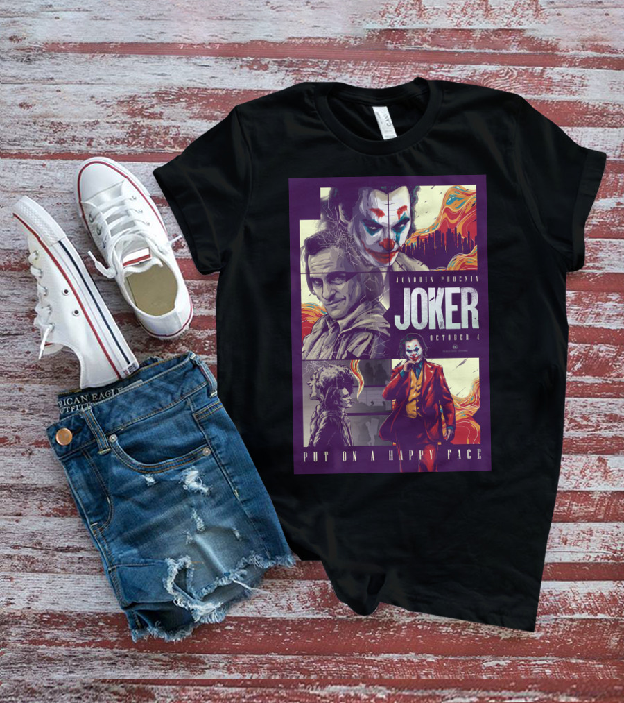 The Joker Joaquin Phoenix October 4 Put On A Happy Face Shirt offers a regular fit. Made from 100% ring-spun cotton that is pre-shrunk to help maintain size and shape after washing. Features reinforced construction details for durability. Available in U.S. standard sizes S-5XL to accommodate various body types.