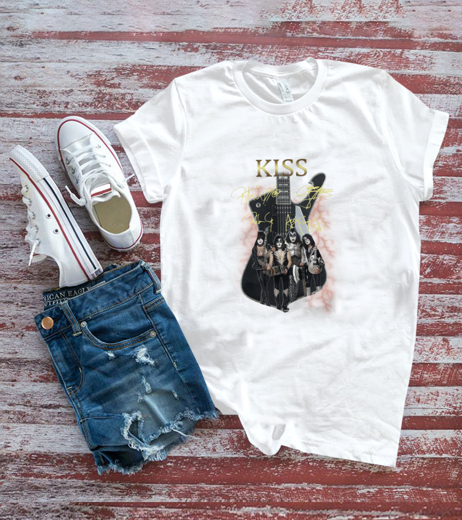 The Kiss Electric Guitar with Band Members Shirt offers a regular fit. Made from 100% ring-spun cotton that is pre-shrunk to help maintain size and shape after washing. Features reinforced construction details for durability. Available in U.S. standard sizes S-5XL to accommodate various body types.