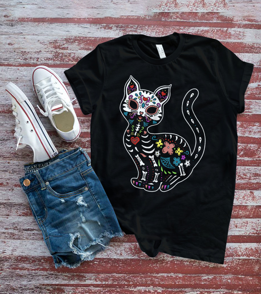 Calavera Cat Dia De Los Muertos Sugar Skull Colorful Skeleton Decor T-Shirt