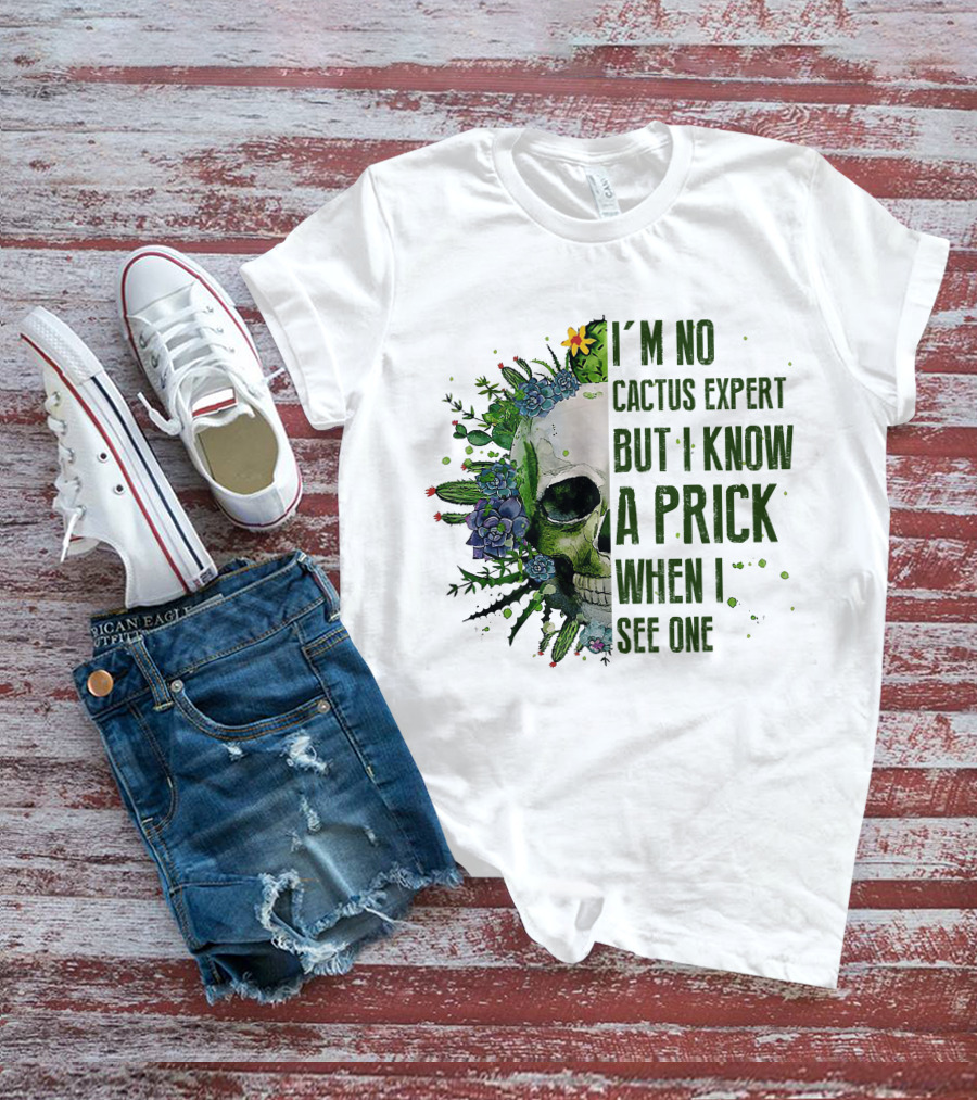 The I'm No Cactus Expert But I Know A Prick When I See One Skull Surrounded by Cacti and Flowers Shirt offers a regular fit. Made from 100% ring-spun cotton that is pre-shrunk to help maintain size and shape after washing. Features reinforced construction details for durability. Available in U.S. standard sizes S-5XL to accommodate various body types.
