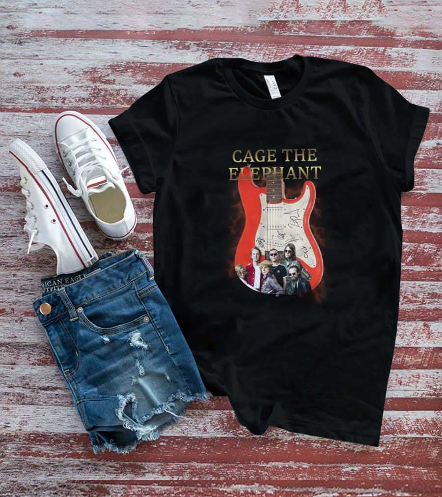The Cage The Elephant Red Electric Guitar Signatures and Band Montage Shirt offers a regular fit. Made from 100% ring-spun cotton that is pre-shrunk to help maintain size and shape after washing. Features reinforced construction details for durability. Available in U.S. standard sizes S-5XL to accommodate various body types.