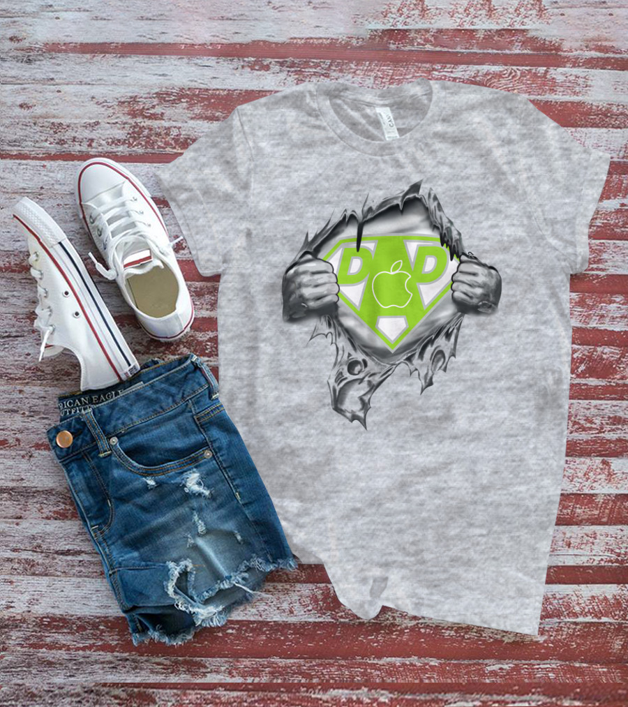 The Super Dad Apple Logo Hero 419 Shirt offers a regular fit. Made from 100% ring-spun cotton that is pre-shrunk to help maintain size and shape after washing. Features reinforced construction details for durability. Available in U.S. standard sizes S-5XL to accommodate various body types.