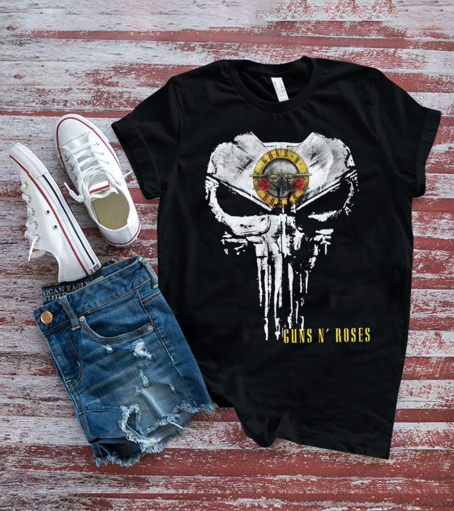 The Guns N' Roses Punisher Skull Icon With Revolvers And Red Roses Shirt offers a regular fit. Made from 100% ring-spun cotton that is pre-shrunk to help maintain size and shape after washing. Features reinforced construction details for durability. Available in U.S. standard sizes S-5XL to accommodate various body types.
