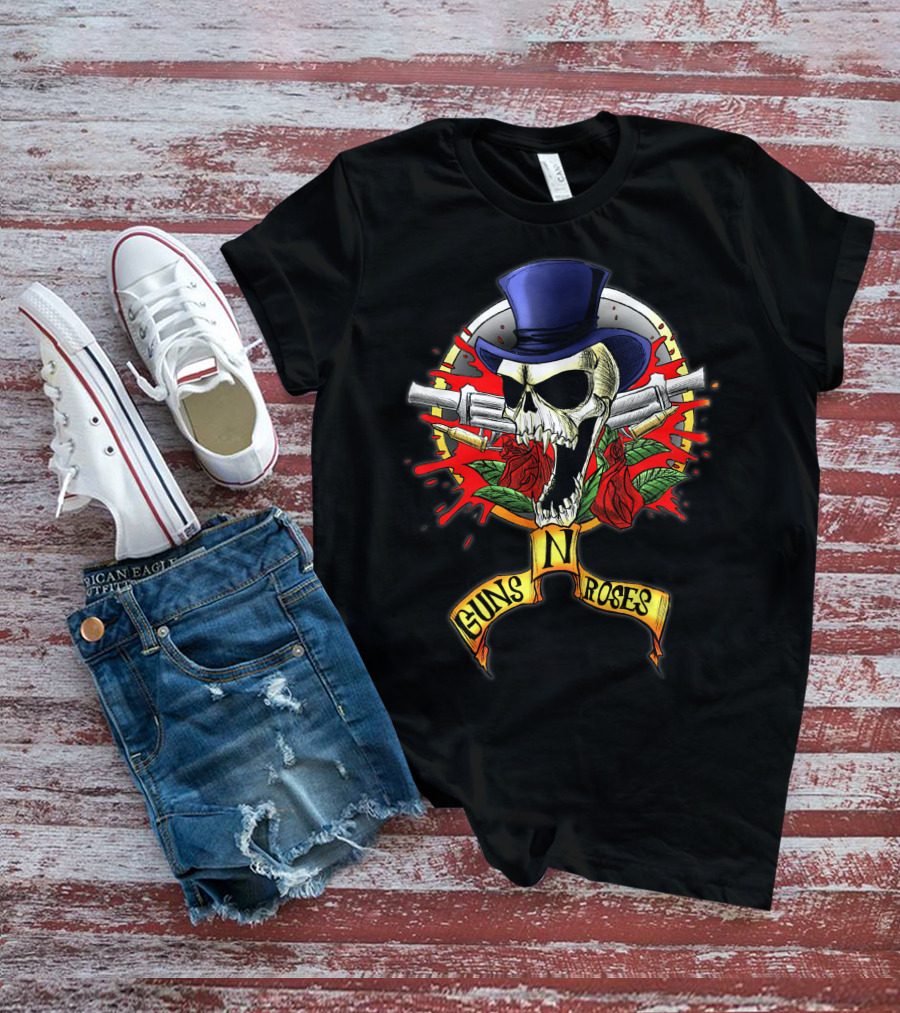Guns N' Roses Skull With Top Hat Crossed Pistols And Red Roses T-Shirt